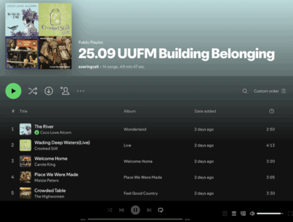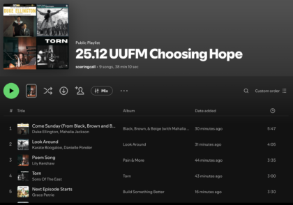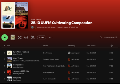 Please email music@uufm.net with suggestions for upcoming playlists. We’d love your musical inspirations for any of our monthly themes or special events.